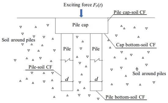 The mechanical impedance method requires the application of an instantaneous excitation force to the pile cap surface to measure the resulting surface vibration response. The interaction between the pile cap, pile foundation, and layered subsoil introduces contact non-linearities into the system’s dynamic response. These interactions, which occurred across various contact interfaces (CFs), are illustrated in Figure 2.