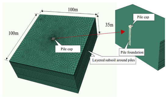 Three-dimensional numerical model of bearing platform–pile group–soil.