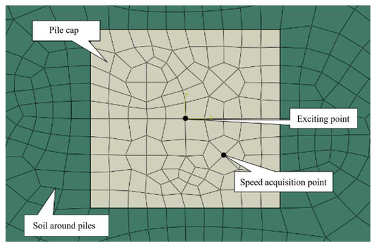 Given the complex mechanical behavior of soil, influenced by factors such as the density, loading conditions, and void content, an ABAQUS finite element model was developed to simulate the dynamic interaction between the cap, pile group, and soil (Figure 3). Figure 4 illustrates the arrangement of the excitation and measurement points in the numerical model.