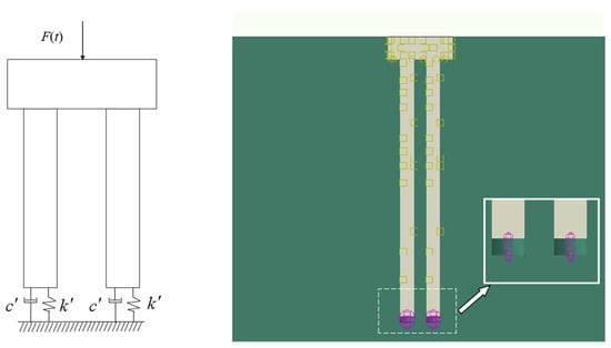 For accurate calculations, an eight-node linear hexahedral element was used for the foundation soil. A graded mesh, refined near the pile cap and progressively coarser away from it, was used, as shown in Figure 3. The finite element mesh featured 30 divisions for the 100 m region and 15 divisions for the 35 m region. The mesh employed a linear order and a reduced integration scheme with hourglass control, and it was finely meshed around the cap. Rigid contact was modeled between the cap and pile, while frictional contact was used at the interfaces between the cap/soil and pile/soil, to capture the interaction of different components. Vertical interaction was assumed between the pile base and the surrounding soil under the excitation load. Due to the significant difference in stiffness between the pile and soil and the small relative displacements, a viscoelastic interaction was modeled. Spring-dashpot elements were incorporated between the pile base and the surrounding soil to simulate this viscoelastic behavior (Figure 5). Spring and damping coefficients at the pile base–soil interface were determined using elastic half-space theory [37].