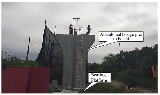 To validate the presented numerical model, experimental data from existing studies [39,40] were utilized. These tests were conducted on an abandoned pier of the Beijing subway line in the western suburbs (Figure 6), which was cut during the compression bearing test and dynamic test. The pier foundation comprised four friction piles constructed of C30 concrete, with a nominal length of 23 m and a diameter of 1200 mm.