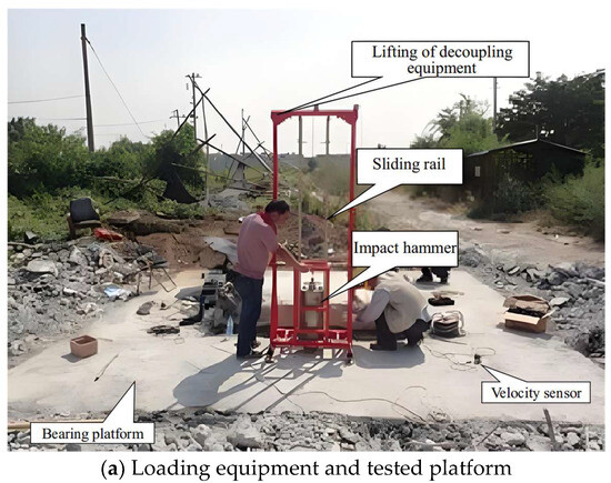 An impact hammer was developed to excite the vibration of the pile foundation (Figure 7a), and four velocity sensors were laid out on the corner of the bearing platform (Figure 7b).