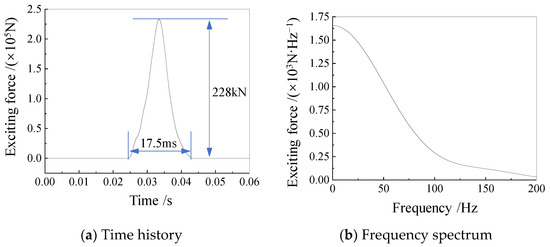 Loading excitation of on-site test for dynamic stiffness: (a) Time history of the applied excitation; (b) Frequency spectrum of the applied excitation [19].
