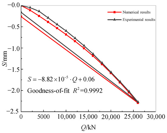 The numerical model’s Q-S curve was fitted linearly, yielding a vertical static stiffness value of for the cap–pile group. This value closely approximated the experimental value of .