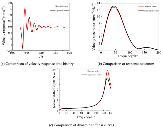 Figure 10 shows the comparison between the numerical simulation results and the dynamic load test results of the pile foundation. It can be seen that the velocity time histories and frequency spectra from the pile cap sensors generally matched. In the frequency range below 100 Hz, the dynamic stiffness values from the numerical simulation aligned well with the experimental values.