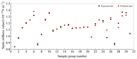 Table 2 shows that the Gaussian process regression (GPR) algorithm using the ARD Matern 3/2 kernel function achieved the highest prediction accuracy. Figure 12 illustrates the comparison between the predicted and actual vertical static stiffness values for this method. The plot demonstrates a close agreement between the predicted and expected values, indicating high accuracy in the predictions.