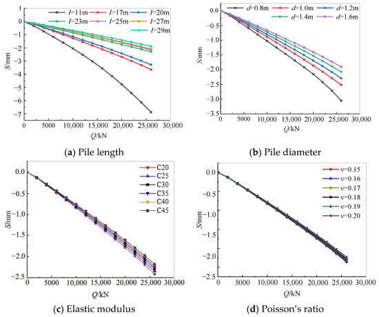 Figure 13 shows the influence of the pile length, pile diameter, elastic modulus, and Poisson’s ratio of the pile group foundation on the Q-S curve and static stiffness. It can be seen that under the layered soil conditions in the tested field, the vertical static stiffness of the structure was directly proportional to the pile length, pile diameter, pile elastic modulus, and Poisson’s ratio. The bearing capacity of the structure increased significantly as the pile length increased from 11 m to 23 m, and the increase slowed down after the pile length reached 23 m. It is recommended that the designed pile length in this area should be no less than 17 m. The bearing capacity of the structure also increased significantly as the pile diameter increased from 0.8 m to 1.2 m. The vertical static stiffness value of the structure is less sensitive to changes in the elastic modulus and Poisson’s ratio of the concrete.