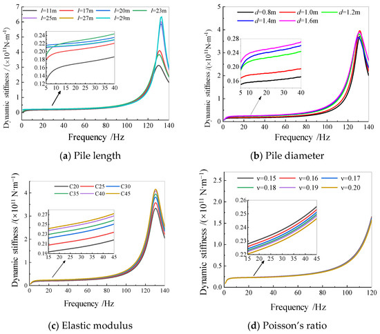 Figure 15 shows the influence of the pile length, pile diameter, elastic modulus, and Poisson’s ratio of the pile group foundation on the dynamic stiffness. It can be seen that under the layered soil conditions in the tested field, the vertical dynamic stiffness of the structure in the high-frequency range of 130–140 Hz increased sharply with the increase in the pile length, and the change was drastic. However, with the increase in the pile diameter, the vertical dynamic stiffness value increased sharply in the medium–high frequency range of 100–120 Hz, and the change in the high-frequency range was not obvious. The changes in the elastic modulus and Poisson’s ratio of the pile body had no significant impact on the medium–high and high-frequency ranges of the vertical dynamic stiffness, indicating that the high-frequency range vertical dynamic stiffness value is not suitable for evaluating the vertical bearing capacity of pile foundations.