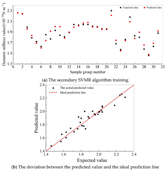 Table 3 presents the evaluation metrics for the prediction results of all the regression algorithms using a 20 Hz excitation frequency for the dynamic stiffness. The results indicated that the Gaussian process regression (GPR) algorithm employing the Matern 5/2 kernel function, yielded the highest prediction accuracy. Figure 14 displays the comparison between the predicted and actual dynamic stiffness values. The figure shows a generally close agreement between the predicted and expected values, highlighting the high accuracy of the model.