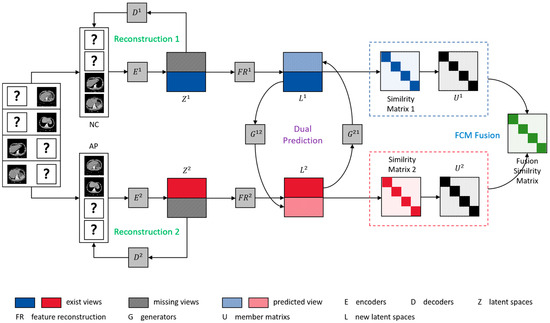 Liver tumors represent a significant contributor to mortality and are associated with various diseases, posing a considerable threat to human health [1,2,3]. A widely utilized method for the postoperative diagnosis of liver tumors is multiphase contrast-enhanced computed tomography (CECT) [4]. Compared with single-view methods, in clinical practice, multiphase views provide consistent and complementary information from the same patient [5,6], thus providing more precision regarding postoperative liver tumor type. Liver tumor CECT images of a patient can be divided into four phases: non-contrast (NC), arterial phase (AP), portal venous (PV), and delay phase (DP) [7,8]. Judging tumor type from CECT images is a laborious and time-wasting task for clinicians, meaning that a large number of these images are not “gold standard”. Moreover, some medical workers do not have enough experience. Hence, to further utilize such unlabeled multiview data, it is essential to introduce an unsupervised method, such as multiview clustering (MVC) [9,10,11,12]. Unfortunately, due to data theft and patient privacy, it is hard to collect complete data during transmission.