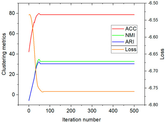 We implement our approach using PyTorch 1.8.0 on an NVIDIA GeForce RTX 2080Ti GPU (NVIDIA, Santa Clara, CA, USA). The Adam optimizer is employed, with an initial learning rate of 0.0001 applied across all datasets. Initially, we set the batch size to 256 and the training epoch to 500 for all datasets. We set up the two trade-off hyper-parameters and to 0.1 and 0.1, respectively. The evaluation metrics validate the cluster performances as follows: ACC, NMI, and ARI.
