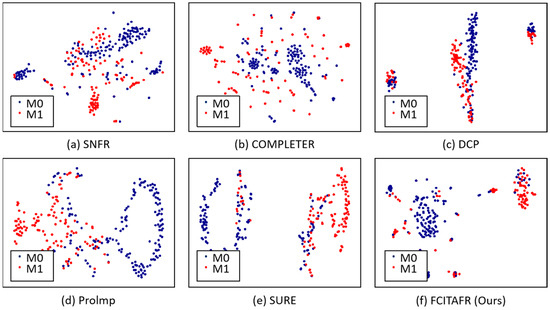 Furthermore, we visualized the latent space via t-SNE on Zheyi with the missing rate of 0.3, as shown in Figure 4. Based on the statistical analysis, the following observations can be summarized: (1) The clustering performance sharply increased during the first 75 epochs; this is because FCITAFR effectively learns the structures of the framework and then the features learn adequately. As a result, the clustering performance levels stay consistent. These findings indicate that the proposed method achieved training convergence. (2) The loss is significantly decreased during the first 75 epochs. This is because FCITAFR utilizes the latent features and reduces the gap between the original features and predicted features.