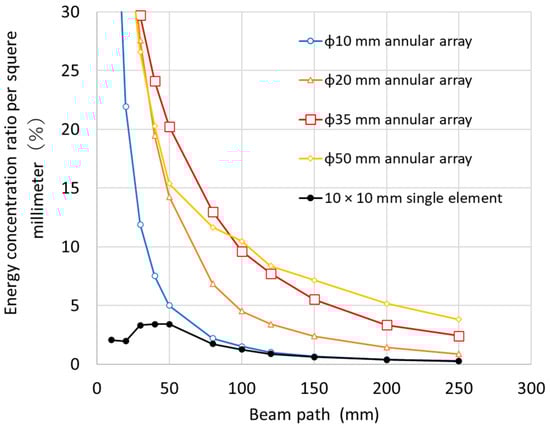 Relationship between the energy concentration ratio per square millimeter and beam path showing the effect of the aperture size of the annular array probe.