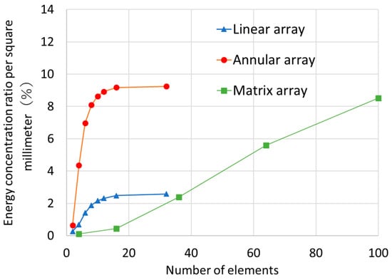 For the linear array and annular array probes, the energy concentration increased with the number of elements, and when the probes were divided into eight or more elements, the energy concentration approached that obtained when the probes were divided into 32 elements (Figure 2). Point focusing using an annular array probe achieved 3.5 times higher energy concentration than line focusing using a linear array probe. In matrix array probes, increasing the number of elements should increase the energy concentration further, but the same energy concentration as an annular array probe would require 100 elements (vertically and horizontally). Approximately 10 divisions were required for both.