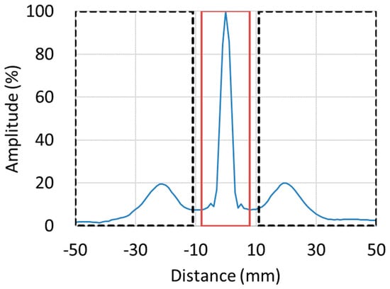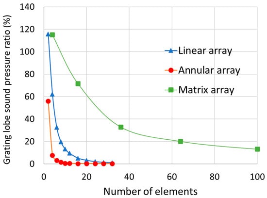 The difference in the generation of grating lobes between the annular array probe and the matrix array probe was also measured. Figure 3 shows an example of a linear sound pressure distribution centered on the position of the maximum sound pressure and the peak of the grating lobe is visible. The sound pressure distribution was obtained for a 64-channel matrix array probe in which a 35 × 35 mm transducer was divided vertically and horizontally into 8 sections, and strong grating lobes were generated. The ratio between the maximum sound pressure of this main pole and the maximum value of the grating lobes on both sides was measured as the sound pressure ratio of the grating lobes (Figure 4). The annular array probe had the smallest grating lobe sound pressure ratio, whereas the matrix array probe had the largest. For example, for the matrix array probe, the grating lobe sound pressure ratio was approximately 13% even when it was divided into 100 elements (10 vertically and horizontally), whereas the annular array probe with only 4 elements had a much smaller grating lobe sound pressure ratio.