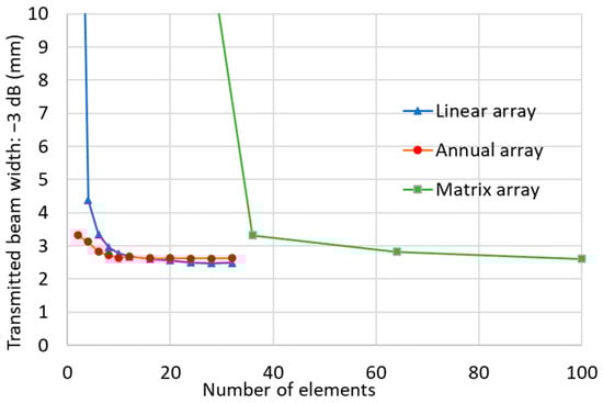 Effect of the number of elements of equal width into which a transducer of 35 mm was divided on the transmitted beam width measured by the 3 dB reduction method for each type of phased array probe.
