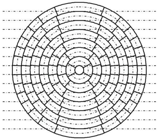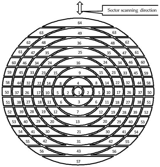 Figure 6 illustrates an element division method devised to achieve sector scanning and excellent point focusing characteristics with an annular array probe. The array probe was designed with 113 elements by dividing the rings of an 8-element annular array probe in parallel. The number of elements was 113, but by short-circuiting the elements at symmetrical positions, the pulses excited the elements at symmetrical positions with the same delay law, creating an array probe driven by 64 channels. In addition, the element pitch must satisfy the following condition to prevent grating lobes from occurring. Grating lobes are a phenomenon in which ultrasonic waves are focused in positions other than the focusing direction. This phenomenon is determined by the element pitch d (mm), wavelength λ (mm), and refraction angle (°). The refraction angle was set to 45°, which follows Snell’s law and prevents longitudinal wave components from entering during angle beam inspection [33].