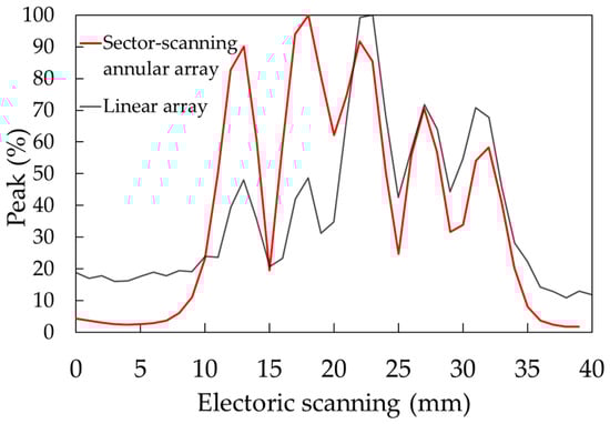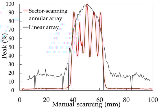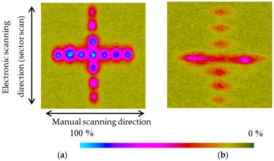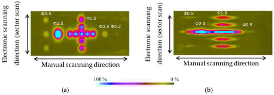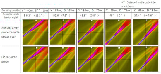 However, point-focusing flaw detection is rarely used in phased-array flaw detection, and line-focusing flaw detection using a linear array probe is more common [21]. Conventional linear array probes can utilize these two scanning methods; however, focusing the ultrasonic beam in the width direction of each element is not possible. On the other hand, conventional annular array sensors can focus on a point and can perform vertical linear scanning but cannot perform sector scanning. Generally, linear array inspection is more widely used [22,23]. This is due to the element arrangement, and the probe used in this paper has an element arrangement that improves on these.