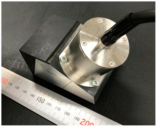 The probe was fabricated according to the specifications shown in Figure 6, and its ability to detect flaws was confirmed. An optical photograph of the fabricated probe is shown in Figure 9. The probe in this optical photograph is equipped with a wedge with an oblique angle of 45 degrees. The probe used a composite piezoelectric element with a diameter of 34.4 mm, the element spacing was 0.1 mm, the wedge was made of acrylic, and the distance within the wedge was 35 mm. The specifications and acoustic characteristic tolerance levels of this probe and the linear array probe used for comparison are shown in Table 1. Figure 10 shows the dimensions of each probe. The ultrasonic flaw detector was MultiX (M2M, France). Flaws were detected using sector scanning on a wedge with a nominal refraction angle of 45°, using two specimens with flat-bottomed holes and spherical flaws at a depth of around 75 mm.