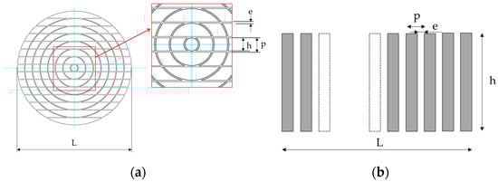 The sector scanning performance of the probe described in Section 2.6 was verified by using a numerical simulation. For comparison, numerical simulation results were used for a linear array probe in which the element was divided into 15 parts with the same ele-ment dimensions. In the linear array probe, a transducer with a length of 35 mm and a width of 20 mm was divided into 15 elements of the same shape by parallel straight lines, and the frequency was 5 MHz. In a numerical simulation, it was difficult to divide the el-ements as shown in Figure 6, so the elements were divided approximately by dividing each ring radially as shown in Figure 7. The centers of the element widths coincided.