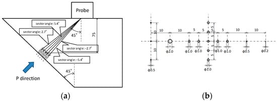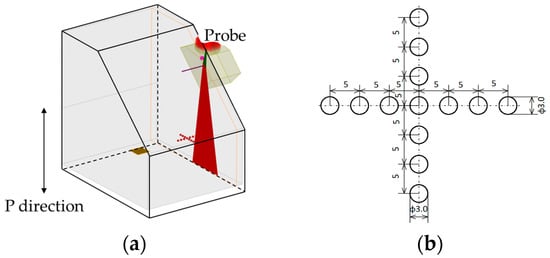 Configuration of test piece with embedded spherical flaws 3 mm in diameter with the (a) lateral direction and (b) P-direction view.