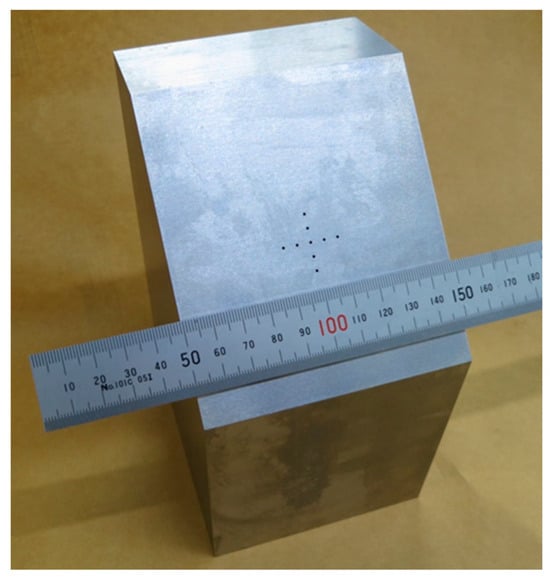 Flat-bottomed holes of various sizes were created centered at a depth of 75 mm, and the detectability of flaws was examined. The flat-bottomed holes had diameters of 200 μm to 2.0 mm (Figure 11). Flat-bottomed holes with a length of 10 mm were introduced using a flat-bottomed drill, but because the length of the flat-bottomed hole with a diameter of 200 μm was 4 mm, which was the machining limit, the center depth was 79.2 mm. Figure 12 shows an optical photograph of the test piece.