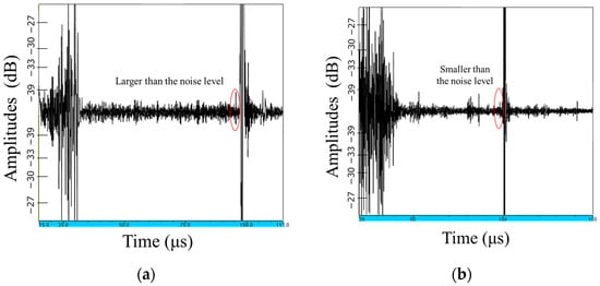 Ultrasonic reflection waves (A-scan) from a 200 μm diameter flat-bottom hole with the (a) sector scanning annular array probe and (b) linear array probe.