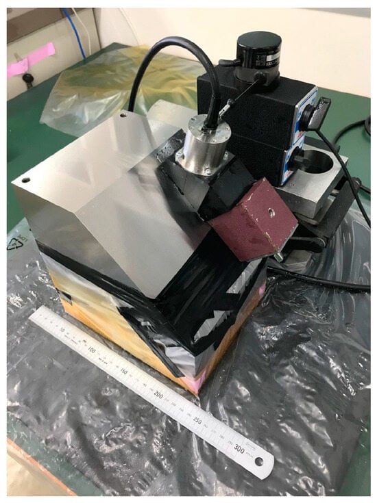 A test specimen containing spherical flaws with a diameter of 3 mm arranged in a crisscross pattern at 5 mm intervals was prepared by diffusion bonding. Before bonding, hemispheres with a diameter of 3 mm were fabricated on the two bonding surfaces, and then the positions of the two hemispheres were aligned to create the spherical flaws when the surfaces were joined. Figure 15 shows an outline of the test specimen. Figure 16 shows an optical photograph of the measurement conditions for this test piece. For sensitivity adjustment, a 20 × 20 mm planar flaw was fabricated. The flaw detection method was the same as in Section 3.2.2, but when the sensitivity was adjusted, the echo height from the planar flaw was set to 80% of the full scale, and the flaw detection image was amplified by 27 dB.