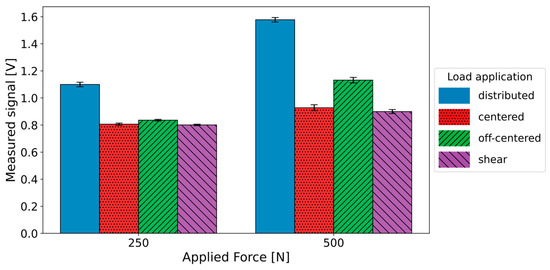 - To evaluate the effect of a force distributed over an area smaller than the intended one, the tests were repeated so that the force was delivered to the sensor through a spherical tip. To test this configuration, three load repetitions at 250 N and 500 N were applied to the sensor. Higher forces were not applied in these tests to avoid damaging the sensor;