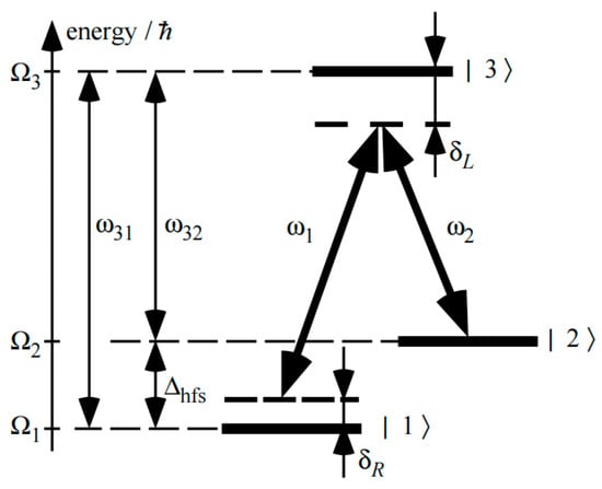 A coherent configuration with a narrow linewidth can trap resonances in a system with two long-lived states |1⟩ and |2⟩ and an excited state |3⟩ that is coupled by two light fields and to the excited state |3⟩, where E1 and E2 are the electric field amplitudes of the two laser beams respectively, while and are their corresponding angular frequencies, additionally, and are the additional phase of the optical fields, whose energy-level arrangement is similar to the Greek letter Λ for a three-level system and is therefore called the Λ system. For example, in alkali metal atoms, |1⟩ and |2⟩ can be associated with the two hyperfine components of the ground state, and |3⟩ and the first excited state are linked. Here, it is assumed that each light field interacts only with one transition. According to the definition, the double-photon detuning and the Raman detuning , = represent the splitting frequencies of the quantum states |1> and |2>. The energy levels are represented by the corresponding equivalent frequencies (where i = 1, 2, 3) as shown in Figure 1 [12,16].