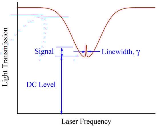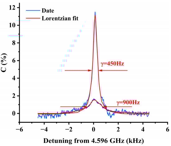 The CPT signal is defined by contrast, which is the ratio of the signal amplitude to the background radiation, as shown in Equation (2), where the variables are the same as in Equation (1), C = Signal/DC Level, as shown in Figure 2. Contrast is a key parameter that affects the stability of CPT resonance or the sensitivity of magnetometers [21]. In the red spectral line shown in Figure 2, the central peak represents the CPT resonance signal, while the remaining portions correspond to the Doppler optical absorption line.