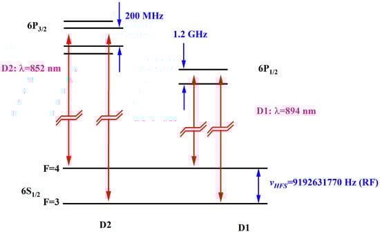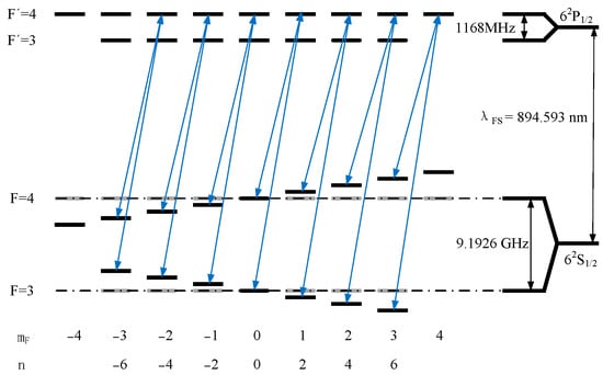 Figure 4 shows the D₁ excitation scheme within the hyperfine structure of 133Cs. F denotes the total angular momentum quantum numbers, while the magnetic quantum numbers of the 6²S₁/2 ground state are denoted by mF; for the excited states 6²P1/2, the symbols are primed. The vacuum wavelength corresponds to the fine structure transition 6²S1/2→6²P1/2. The hyperfine ground-state splitting frequency is denoted by . Each pair of blue arrows builds up a so-called Λ system, which causes a magnetic field-dependent CPT resonance. The gray-colored interrupted lines represent the frequencies corresponding to mF that are not affected by the magnetic field. The frequency between the upper and lower energy levels of the ground state is equal to . The energy shift introduced by the magnetic field is expressed as . According to the selection rules of two-photon transitions [19,29], there may be an n = 0 Λ system (magnetically insensitive), two n = ±1 Λ systems, four n = ±2 (displaying two in Figure 4) Λ systems, and four n = ±3 Λ systems; n = ±4 and n = ±6 Λ systems can be ignored when measured.