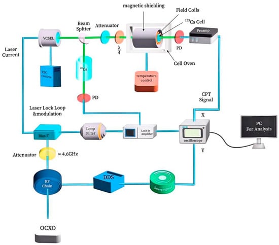 The experimental setup for parameter optimization is shown in Figure 5. A dual-color light field is generated by modulating the injection current of the VCSEL laser at half of the hyperfine splitting frequency ( = 9.2 GHz) to form the Λ system. The two first-order optical sidebands are completely hyperfinely split apart, forming the Λ system. The system uses an independent reference atomic cell through laser frequency modulation and a locking loop to stabilize the VCSEL laser frequency. The adjustment of the light intensity is achieved by using different transmission rate neutral filters to produce σ+ circularly polarized light with a quarter-wave plate. The atomic cell constant-temperature bath can be set to different working temperatures and controlled to an accuracy of 0.01 °C. The sweep signal is combined with a direct digital synthesizer (DDS) to achieve 4.6 GHz microwave frequency synthesis and Raman frequency scanning, producing a CPT resonance signal that is displayed on an oscilloscope and captured and processed by a PC. The oven-controlled crystal oscillator (OCXO) is the reference clock for the 4.6 GHz microwave frequency.