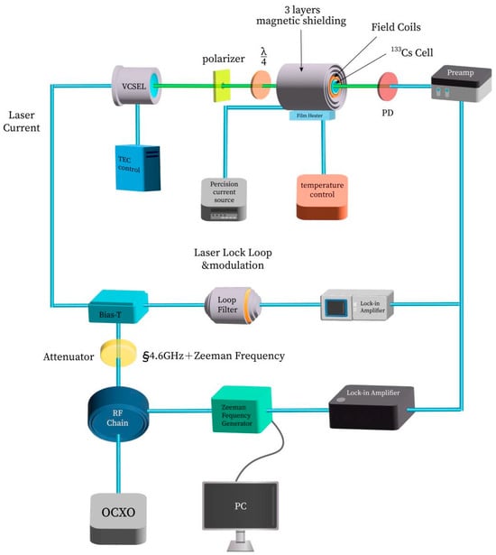 The coupled dark-state atomic magnetometer experimental setup, as shown in Figure 6, is a principal device for a dark-resonance atomic magnetometer that conforms to the excitation scheme of the 133Cs hyperfine structure D1 line spectrum, as shown in Figure 6. The laser frequency stabilization control loop is the same as that in Figure 5. The Zeeman frequency generator generates a frequency that is associated with the magnetic field B, modulates the 4.6 GHz microwave signal, and causes the VCSEL laser to produce a second-order frequency-modulated spectrum. The orthogonal output signal of the lock-in amplifier is demodulated to obtain the CPT resonance peak, whose zero point corresponds to the frequency value in (4), and can be used to calculate the value of the magnetic field B using (4). The collected magnetic field B data are processed to produce a Fourier transform amplitude spectrum (i.e., the root mean square of the noise power spectrum), which can provide the power spectral density (PSD) curve, while the PSD value at 1 Hz is used as a reference value for the sensitivity of the magnetometer [23,33].