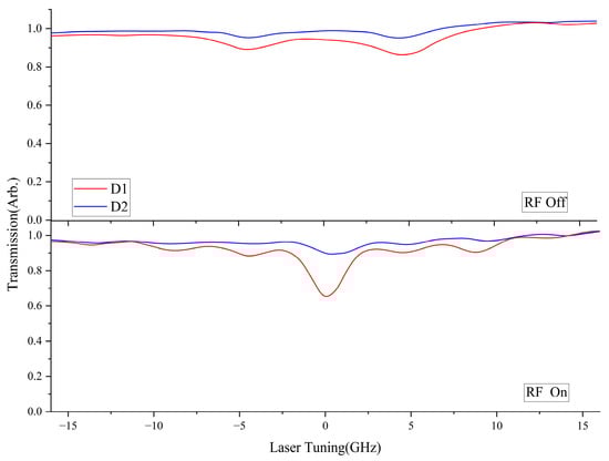 The absorption spectrum of VCSEL after passing through an atomic cell is shown in Figure 7. The blue line represents the D2 line laser, and the red line represents the D1 line laser. After the VCSEL is modulated by a 4.6 GHz microwave, the peak-to-peak increase in the absorption peak is approximately five times, and the trace is normalized to the Doppler absorption value.