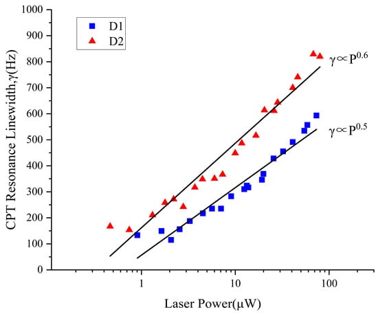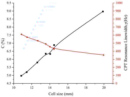 By solving the density matrix equation for the three-level Λ system atomic ensemble, one can obtain the linewidth formula for the CPT resonance [9,19,20]. The linewidth γ of the resonance line is the full width at half-maximum (FWHM) of the resonance spectral line.