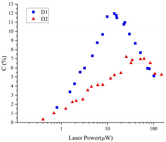 Laser power broadening is an important mechanism that affects the linewidth of the CPT resonance peak. Under the same VCSEL laser power, the linewidth of the D1 line is smaller than that of the D2 line, and the D1 line and D2 line are related to the VCSEL power by different exponential relationships. After fitting, the relationship between the D1 line γ and VCSEL power is γ ∝ P0.5, and the relationship between the D2 line γ and VCSEL power is γ ∝ P0.6. The relationship between the CPT resonance linewidth and VCSEL wavelength and laser power is shown in Figure 9. Due to power broadening, the CPT linewidth increases with the laser power. The relationship between the contrast of the CPT resonance and the VCSEL wavelength and laser power is shown in Figure 10. The contrast also varies with the incident laser power, with a peak, and the contrast has already decreased significantly at laser powers above 100 μW. The incident laser power into the atomic cell can be set to around 20 μW.