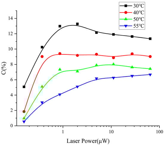 The operating temperature of the atomic cell affects the contrast of the CPT signal. When the temperature rises, the atomic density increases, and the CPT signal will accordingly be enhanced. However, the noise will also increase accordingly, and the signal-to-noise ratio is not proportional to the temperature in a simple way. At the same working temperature of the atomic cell, the laser power incident on the atomic cell is different, and the contrast of the CPT signal is also different. The experimental results are shown in Figure 14. From the measured data of the CPT signal contrast versus laser power at four different temperature points, as shown in the figure, it can be seen that when the temperature is higher, the contrast of the CPT signal changes slowly with the intensity of the light, and the contrast in the weak light power region increases rapidly with the decrease in temperature. When the temperature is lower than a certain value, the contrast of the CPT signal reaches a maximum value at the light power curve. Notably, if the temperature is too low, even if the contrast is large, when the CPT signal amplitude is too small, the signal-to-noise ratio will deteriorate. From the experimental results, the operating temperature of the cesium atomic cell is preferably in the range of 40 °C to 50 °C.
