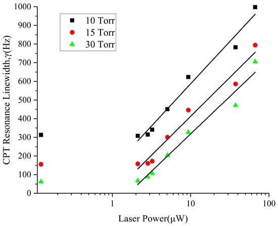 When buffer gasses were introduced into the atomic cell, in order to reduce the collision broadening, we selected N2 with a positive pressure shift coefficient and Ar with a negative pressure shift coefficient, with a pressure ratio of 1:2. In the experiment, the total pressure of N2 and Ar was 10 Torr to 30 Torr, and the linewidth of the CPT signal obtained by interacting with different incident laser powers was measured. The results show that when the pressure of the buffer gas in the atomic cell is increased, there is a trend for the CPT signal linewidth to narrow, while when the incident laser power is increased, there is a trend for the CPT signal linewidth to widen, as shown in Figure 15, in which the curve characteristics are similar to those in Figure 9. Therefore, it is necessary to compromise and optimize the buffer gas pressure ratio, gas pressure, and light intensity parameters. As a result, the total pressure of N2 and Ar in the cell was 30 Torr while adjusting the laser intensity and temperature points to meet the requirements of optimization.