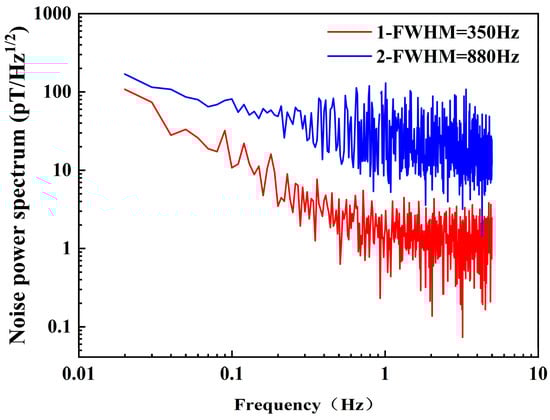 In the coupled dark-state magnetometer experimental setup shown in Figure 6, the 894 nm VCSEL laser from the D1 line was used, and the magnetic field sensitivity measurement method described in the previous section was used. After optimizing the quantum system parameters, the magnetic field measurement sensitivity of the coupled dark-state magnetometer before and after the improvement was compared, as shown in Figure 16. The noise power spectrum at 1 Hz was improved from 20 pT/√Hz to less than 2 pT/√Hz, an improvement of more than ten times. By comparison, a detection noise of 50 pTrms at a 1 s integration time had previously been achieved in the coupled dark-state magnetometer of the China Seismo-Electromagnetic Satellite [29].
