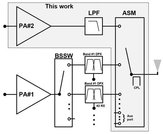 - Tsai, M.D.; Lin, C.C.; Chen, P.Y.; Chang, T.Y.; Tseng, C.W.; Lin, L.C.; Beale, C.; Tseng, B.; Tenbroek, B.; Chiu, C.-S.; et al. A fully integrated multimode front-end module for GSM/EDGE/TD-SCDMA/TD-LTE applications using a Class-F CMOS power amplifier. In Proceedings of the 2017 IEEE International Solid-State Circuits Conference, San Francisco, CA, USA, 5–9 February 2017; pp. 216–218. [Google Scholar]