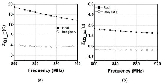 The single-ended output signal from the driver stage is converted into a differential signal using an inter-stage transformer ( with a supply bypass cap (, as shown in Figure 2. Figure 3 shows the detailed layout of the with the metal stack-up of the HBT process. The HBT process used in this work provides three metal layers: M2 and M3 are 4 μm thick metals and M1 is a 1 μm thin metal. To reduce the parasitic resistance of the transformer, stacked M1 and M2 layers are connected through vias, while M3 is used as a bridge metal for routing. As a result, the simulated inductance of the primary coil and secondary coil is 2.5 nH and 3.1 nH, respectively, leading to a high coupling factor of 0.75 at 900 MHz. For these inductances, the parasitic resistances are only 2.2 Ω and 3.9 Ω, respectively. Figure 4a shows the simulated impedance observed from the collector of the driver stage , while Figure 4b shows the impedance observed from the base node of the power stage . While the real part of is observed from 14 Ω to 18 Ω, the imaginary part remains approximately 4 Ω across the given frequency band, ensuring broadband operation. Through the addition of a of 2 pF, the imaginary part of is further flattened to approximately 0.5 Ω, while the real part of is approximately 2 Ω, which closely matches the optimum source impedance of the power stage.