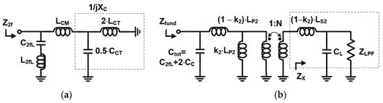 To meet the specification of harmonic power less than −40 dBm, a conventional fifth-order LC LPF is used, as shown in Figure 2. The simulated input impedance of the LPF is Ω, with the component values indicated in Figure 2. Under these conditions, the simulated attenuation exceeds 20 dB at both the second and third harmonic frequencies, while maintaining a low insertion loss of 0.67 dB. The output transformer then converts into the optimum fundamental impedance , which is simulated to be as low as 2 Ω to deliver the maximum output power of 36 dBm, accounting for the insertion losses of both the LPF and ASM. Figure 5 shows the layout of along with the metal stack-up of the laminate. A six-layer lamination process is utilized for PA module implementation, where three metals are dedicated to the construction of . The thickness of the copper is 18 mm. While the and copper layers are used for the secondary coil, is used for the primary coil. The width of the primary metal is set to 200 µm for the handling of a high DC current, while the secondary one is set to 140 µm, which is much narrower, to avoid the misalignment effect of the lamination process. Such a structure enhances the broadside magnetic coupling between the primary and secondary coil, resulting in a high coupling factor = 0.82. An inductance of of 0.3 nH and that of of 1.1 nH are obtained, respectively. Since a second HT is widely adopted in PA design to improve linearity [5,7,8,9], a series resonator composed of a capacitor and an inductor is utilized to reduce the second harmonic impedance, as shown in Figure 5. To ensure a compact module size, the capacitor is implemented using an MIM capacitor within the HBT die, while the inductor is realized using a thick metal layer on the laminate. This harmonic trap offers low loss due to its high quality factor. However, it exhibits a narrower bandwidth, which is insufficient to eliminate the second harmonic component across the entire frequency band. To suppress the second harmonic component corresponding to the fundamental frequency within the 824 MHz–915 MHz range, the implementation of an additional LC second HT could be considered. However, such an addition increases both the insertion loss and the complexity of the module. To address this, a novel approach is proposed to generate an additional pole at the second harmonic frequency. This involves utilizing the even-mode characteristic of the output transformer combined with an appropriately chosen center-tap capacitor , as illustrated in Figure 5. Assuming that the capacitance of , a supply bypass capacitor, is very large, the simplified equivalent half-circuit for even-order frequencies is modeled as shown in Figure 6a. The first resonance pole at the lower second harmonic frequency is generated by the series combination of and . An additional resonance pole at the higher second harmonic frequency is formed by , , and , where is a common-mode inductance of and is an inductance of a metal trace between the center tap of and . Assuming that is an admittance of parallel and as shown in Figure 6a, the required value of to resonate at an additional second harmonic frequency of is given as