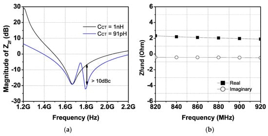 With an of 0.2 nH and of 91 pF, the magnitude of is shown in Figure 7a. Compared with the magnitude with a of 1 nF, it is observed that an additional pole at 1.8 GHz is generated with a of 91 pF, reducing the magnitude of by as much as 10 dB. For the fundamental load impedance analysis, and , assumed to be small inductance values, are ignored. Here, represents the inductance connected with the load capacitor for the third harmonic trap. The equivalent half-circuit at the fundamental frequency is shown in Figure 6b. The fundamental load impedance is given as