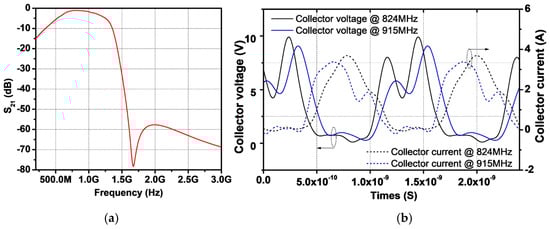 where is the impedance seen from secondary coil toward the load and represents the value of , as shown in Figure 6b. With a of 8.8 pF, the simulated fundamental load impedance seen from the collector of the power stage, , is shown in Figure 7b. The simulation reveals that the real part of is close to 2 Ω as targeted, whereas the imaginary part of is close to zero across the operating frequency. Figure 8a shows the frequency response of the proposed output network. A simulated insertion loss of 1.13 dB is achieved, with attenuation at the second and third harmonic frequencies as low as 60 dB. To verify proper operation for a second harmonic short, the voltage and current waveforms are shown in Figure 8b. As designed, the voltage waveform is squared for both frequencies, while the current waveform forms a half-sinusoidal shape. Figure 9a presents the simulated gain and PAE as functions of output power. The proposed PA module delivers a saturated output power of 36.5 dBm for both frequency bands. The peak PAE is 46% at 824 MHz and 43% at 915 MHz. Additionally, Figure 8 shows a comparison of third-order intermodulation distortion (IMD3). Using a 1 MHz tone spacing at 900 MHz, the proposed dual harmonic trap improves IMD3 by 3.4 dB at an output power of 29 dBm compared to a single harmonic trap.