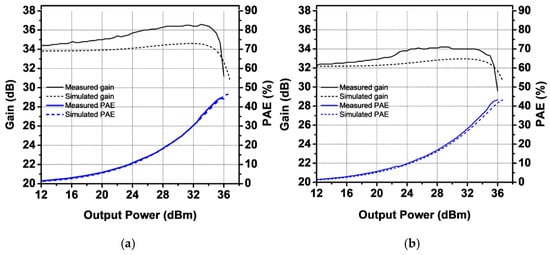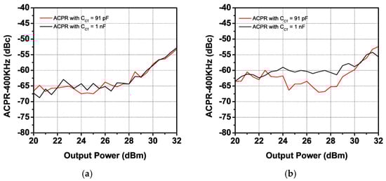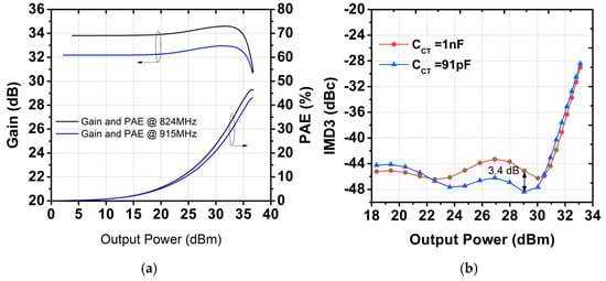 Figure 11 shows the measured S-parameters of the PA module compared with the simulation results. The quiescent current was set to 250 mA, with VCC at 3.5 V and VBAT at 3.8 V. The measured S21 values are 34.4 dB and 32.7 dB at 824 MHz and 915 MHz, respectively. The harmonic rejection at both the second and third harmonic frequencies is less than −80 dBc. The measured S11 is lower than −8 dB, while S22 is below −4 dB. The measured S11 and S22 are slightly different from the simulation results because the simulation was performed taking into consideration only the loss of the in/out metal lanes in the EVB board. The large-signal performance was characterized for two modes: GSM mode and EDGE mode. Figure 12 presents the measured gain and PAE as functions of output power using a GMSK signal. At an output power of 36 dBm, the measured power gain is 31.2 dB and 29.6 dB for 824 MHz and 915 MHz, respectively, with corresponding PAE values of 44.6% and 43.3%. At the saturated output power, the second and third harmonic power levels are below −50 dBm and −43 dBm for both frequency bands. The received band noise at a 20 MHz offset frequency is as low as −88 dBm/100 kHz. Figure 13 shows the measured ACLR at a 400 kHz offset frequency (ACLR-400 kHz) as a function of output power. The ACLR-400 kHz was measured with two different values of to verify improvement in the second harmonic termination effect. While the PA module with different values provides similar ACLR-400 kHz performance at 824 MHz, the ACLR-400 kHz of the PA module with a of 91 pF at 915 MHz improves by as much as 4.8 dBc compared with that of the PA module with a of 1 nF, as shown in Figure 13a. The large-signal performances of the proposed PA module are summarized in Table 2, compared with previous work, including industry products.