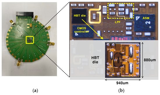 Figure 10a shows a photograph of the evaluation board (EVB) used for testing the PA module, as depicted in Figure 6b. The EVB is constructed using FR-4 material with four metal layers. The top metal layer is utilized for RF signal routing, while the inner layers serve as the circuit ground, DC supply line, and control signal pathways. The proposed HBT PA was fabricated using a commercial 2 mm GaAs HBT technology with Cu bump pillars. The PA die occupies an active area of 0.94 × 0.88 mm2, as shown in Figure 10b. Compared with a bond-wire design, Cu bump pillars not only maintain a compact form factor but also enhance thermal management performance. To further improve thermal conductivity, large bar-type Cu bump pillars are directly placed on the emitter of both the driver and power stages, as illustrated in Figure 10b. The bias circuit’s reference voltage is regulated and supplied by a CMOS controller fabricated using bulk CMOS technology. Additionally, the ASM is fabricated in CMOS SOI technology to achieve low insertion loss. The LPF is implemented with 0402 high-Q inductors and high-Q capacitors. All chips are attached to the laminate using a flip-chip bump process.