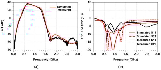 Measured s-parameter results compared with simulation results (a) S21 and (b) S11 and S22.