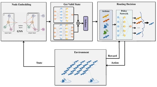 The model architecture of GDRL-SFCR, illustrated in Figure 2, consists of three components: embedding of the LEO satellite network, obtaining a valid state space, and making the routing decision. In the proposed GDRL-SFCR method, a GNN and DRL are combined to optimize routing decisions. The GNN processes the graph-structured data representing the network topology, capturing essential structural features such as node connections and link properties. Then, a MLP is used to obtain the current valid state based on the features of the current node and the neighboring nodes. These features are then fed into the DRL framework, which learns the optimal policy for routing decisions. We will explain the components in detail.