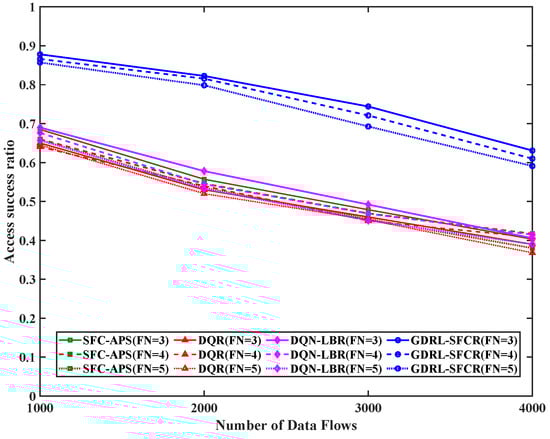 Access success rates of different data flows. The red curve is the result based on the reinforcement learning algorithm (DQR), the green curve is the result of the traditional graph theory algorithm (SFC-APS), the magenta curve is the result of the algorithm proposed in this paper (DQN-LBR), and the blue curve is the result of the algorithm proposed in this paper (GDRL-SFCR). FN represents the total number of functional nodes in the end-to-end path SFC constraint.